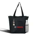 A modern design shopping bag made from 600D polyester. Black bag with coloured side design makes it a trendy shopper. A front handy pouch for your personal items zip closure top key ring hoop black web handles and mesh side pocket to hold your drink bottle. Brand your logo onto this perfect corporate promotional bag for your next event.