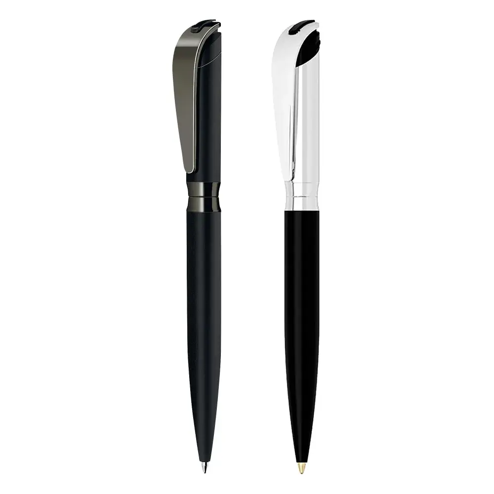 This refined gift set pairs the I-ROQ Ball Pen with the I-ROQ Soft Touch Ball Pen, offering a sleek contrast between a polished silver metal finish and a smooth brass soft-touch surface. Both pens showcase premium European design and are equipped with high-quality Parker-Type Silktech German ink refills, known for their smooth writing and long-lasting performance. Presented in a sleek hard black cardboard gift box with a custom foam insert, this set is perfect for elevating your brand through sophisticated corporate gifting.