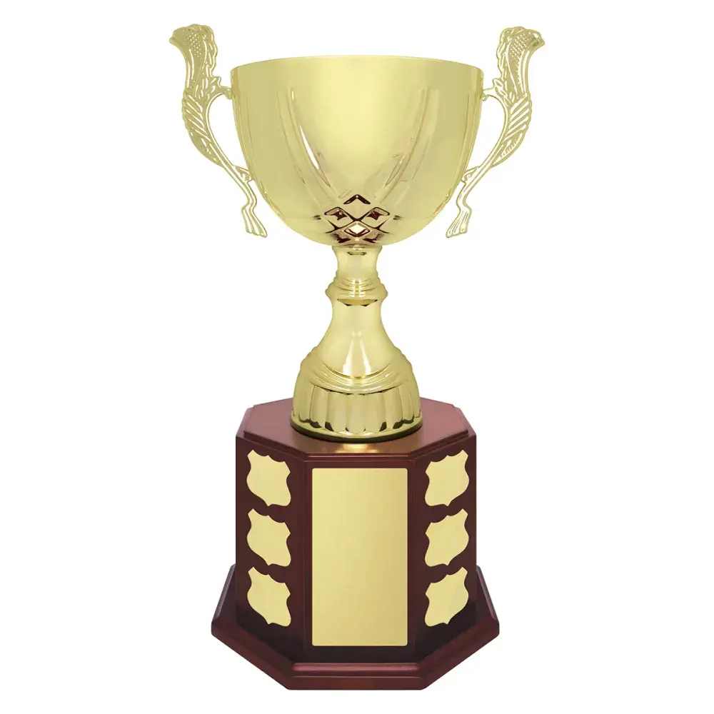 Timber perpetual base with numerous sides offers unmatched scope for personalisation. The Ensign Cup features classic stem and metal bowl combination.