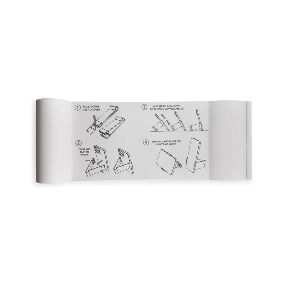 White Phone Stands are supplied in bulk packaging, with usage instructions engraved on the back of each stand.
