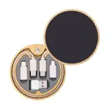 The Reveal Inductive Circle Charger Set is a sleek, all-in-one charging solution crafted from natural bamboo and wheat straw. Compact and functional, it’s the perfect size for your desk while still being portable enough for on-the-go use. Inside, you'll find a Type C to C 50cm cable, along with Type A, Micro USB, and iOS adapters to ensure wide device compatibility. These fast-charging adapters are securely held in place by a grey base insert for neat storage. The star feature? Built-in 15W Qi wireless charging for effortless, cable-free top-ups. Simply plug the unit into power using the included cable to activate the charging surface — perfect for keeping your phone charged throughout the day. For a premium touch, the smooth black acrylic panel on the lid is designed to showcase your brand. Your logo can be laser engraved or digitally printed and will illuminate when the unit is plugged in, offering a standout branding moment on any desk.