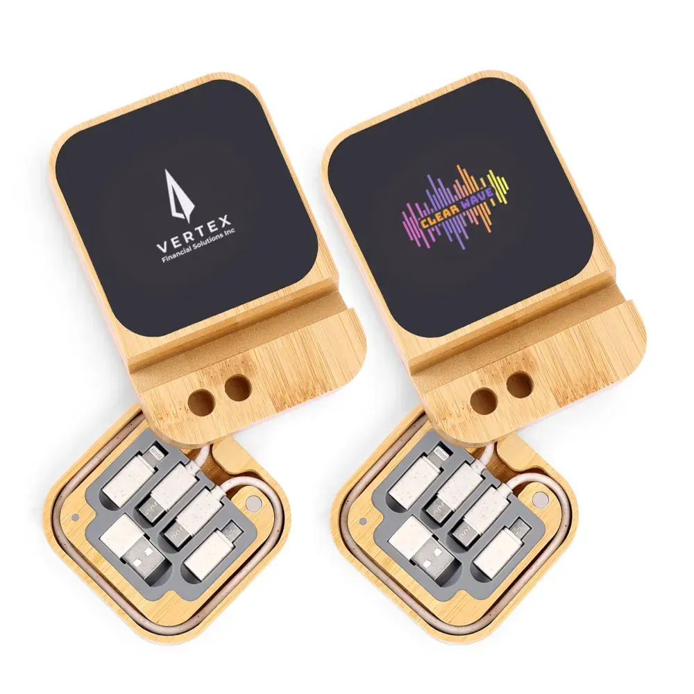 Power up in style with the Wander Wireless Charger Set, the ultimate charging companion for work, travel, and everyday life. Presented in a sleek bamboo case with silicone housing for the cables and a magnetic closure, this set combines convenience and durability. Inside, you'll find a high-performance Type C to Type C cable capable of 60W fast charging with data transfer, as well as Type A, Micro USB, and 8pin adapters, making it the perfect all-in-one solution for multiple devices. Enjoy the added convenience of 15W Qi wireless charging for effortless power-ups. For a premium touch, branding is applied to a large black acrylic panel on the front, which is laser engraved and illuminates when plugged in, ensuring your logo shines through for a standout presentation.