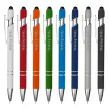 Retractable aluminium stylish design pen with a shiny silver chrome trim soft rubberised barrel in a range of colours and a stylus black top for touch screens. Click action with plastic Cross-Type German manufactured black ink refill 1200 meters writing distance tungsten carbide ball provides you with quality writing. Comes standard with black ink but blue ink is available on request at additional costs.
