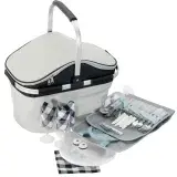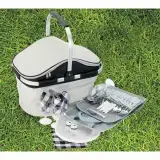 Includes: 4 x SS knife fork & spoon 4 x 9'' PS plate 4 x PS wineglass 4 x cotton napkin 2 x S&P shakers 1 x bottle opener. Jacquard polyester + 600D polyester + aluminium foil lining and 15L capacity