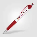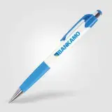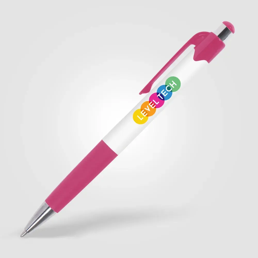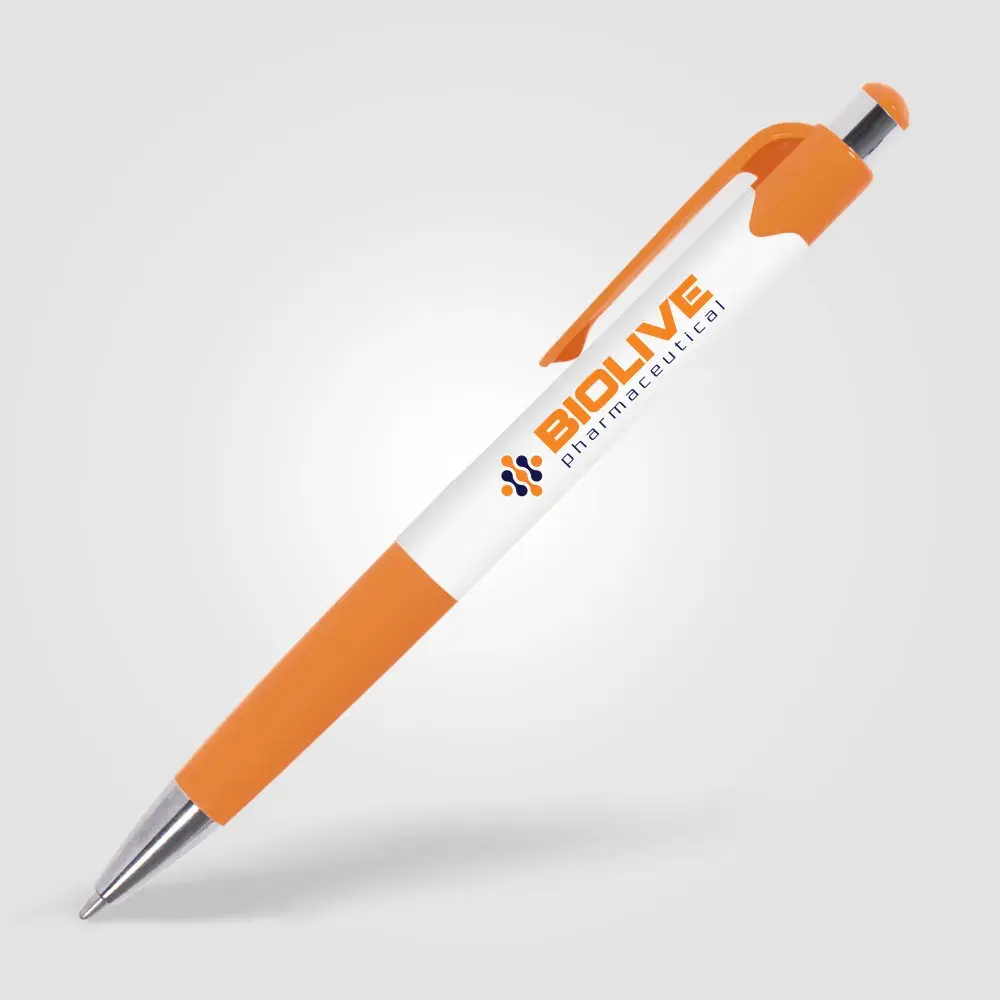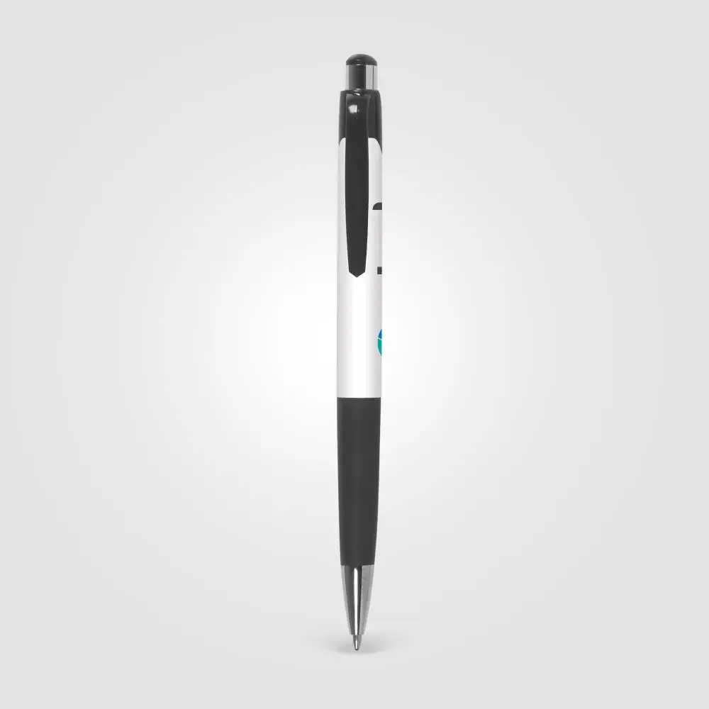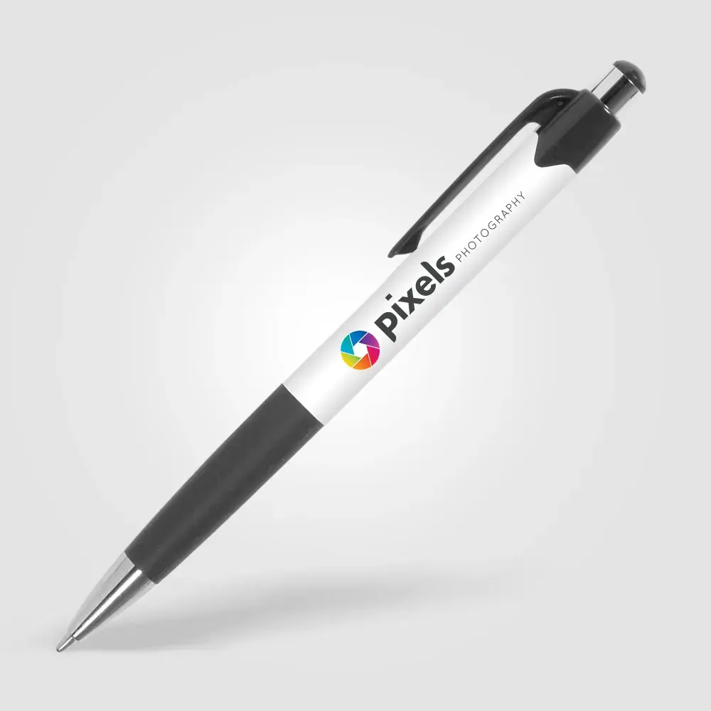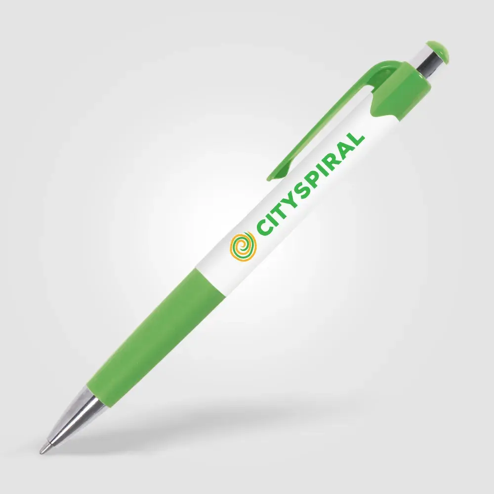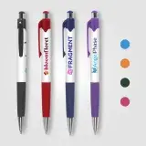 Cost-effective retractable plastic pen with white barrel, coloured trim and chrome accents. 8 vibrant colour options. Supplied with black writing ink. Price includes 1-colour screen-print to one position.