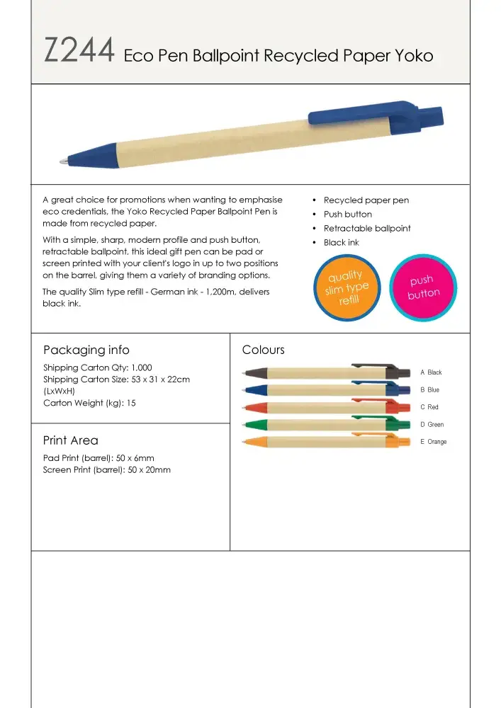 A great choice for promotions when wanting to highlight thoughtful design, the Yoko Recycled Paper Ballpoint Pen is made from recycled paper. With a simple, sharp, modern profile and push-button, retractable ballpoint, this ideal gift pen can be pad printed with a logo in up to two positions on the barrel, giving them a variety of branding options. The quality Slim type refill ” German ink ” 1,200m, delivers black ink.
