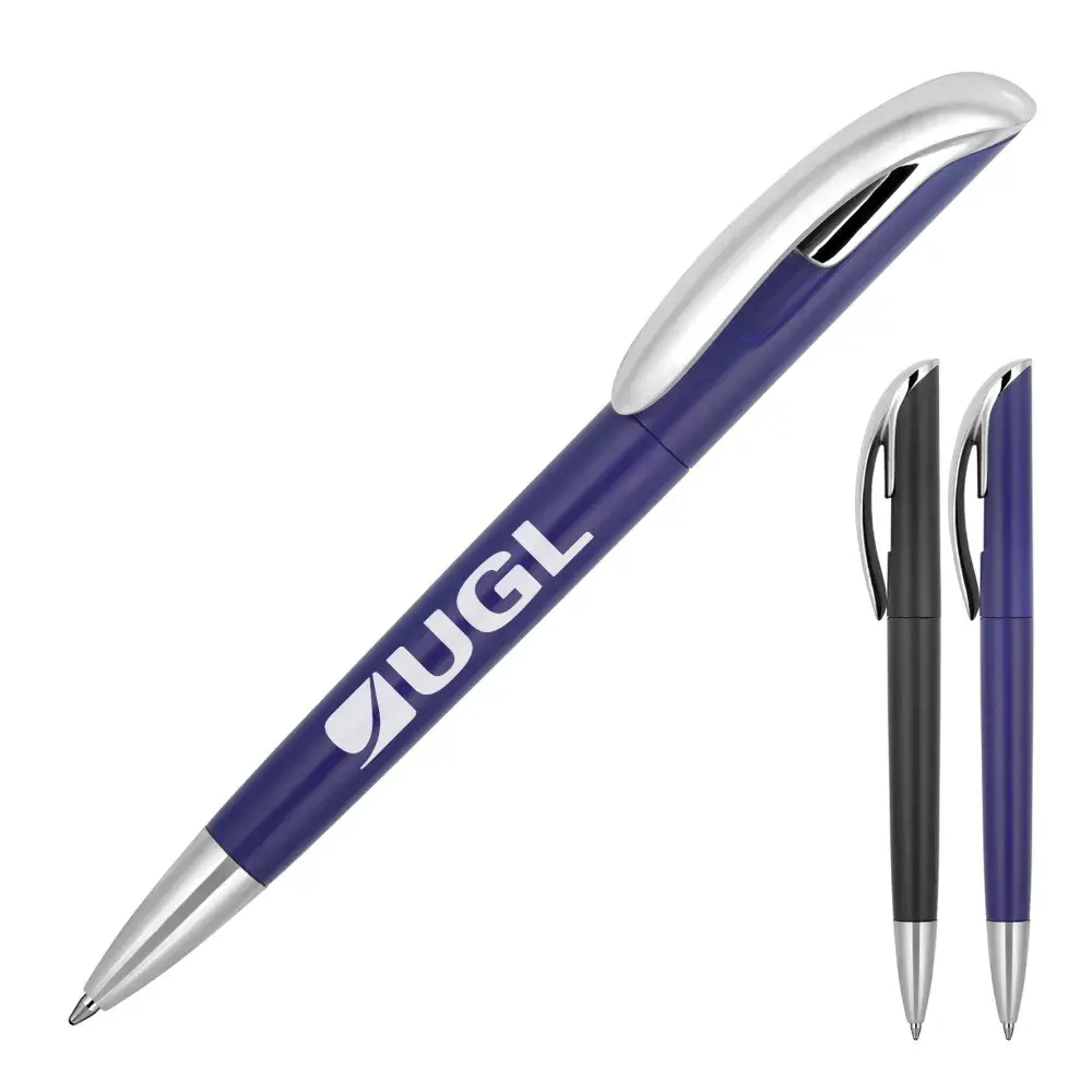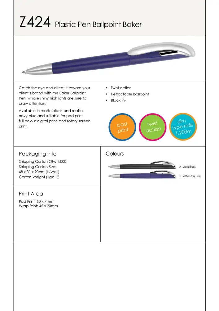 Catch the eye and direct it toward your client's brand with the Baker Ballpoint Pen, whose shiny highlights are sure to draw attention. Available in matte black and matte navy blue and suitable for pad print, full colour digital print, and rotary screen print.