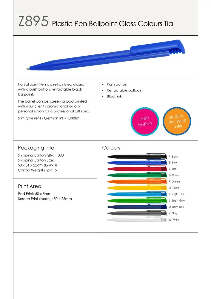 Custom Plastic Pen Ballpoint Gloss Colours Tia