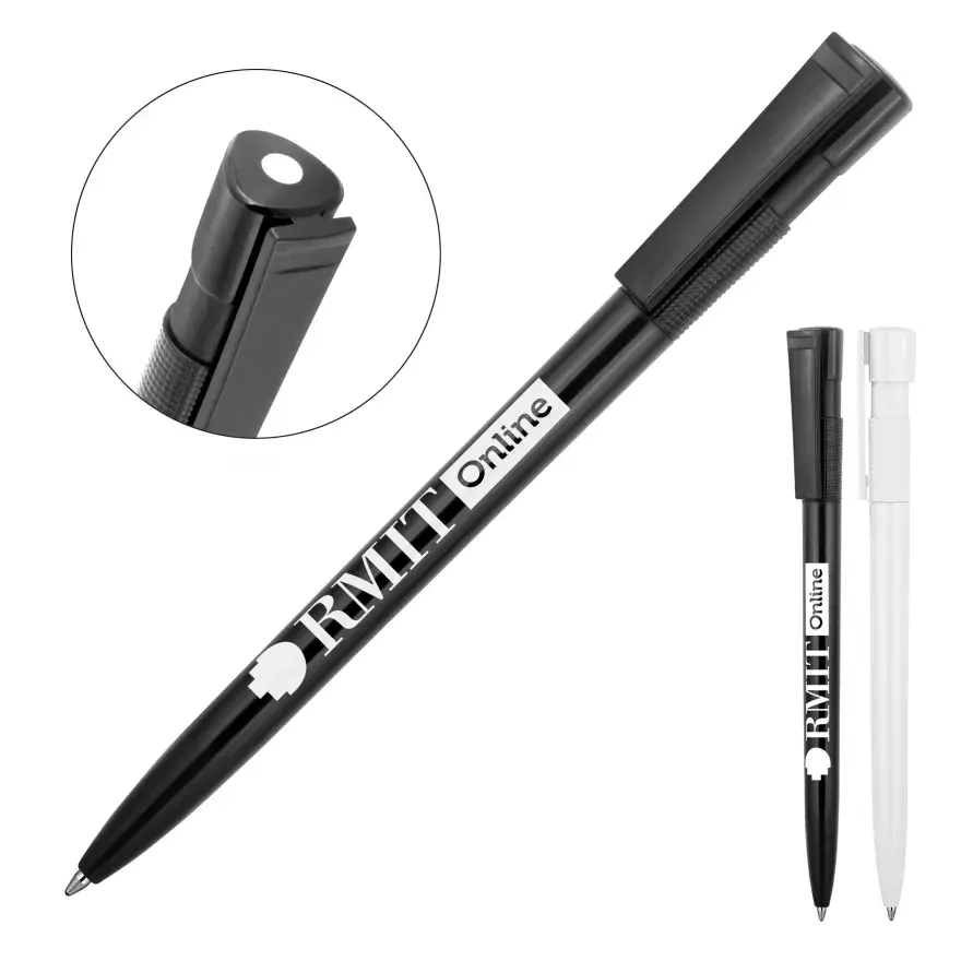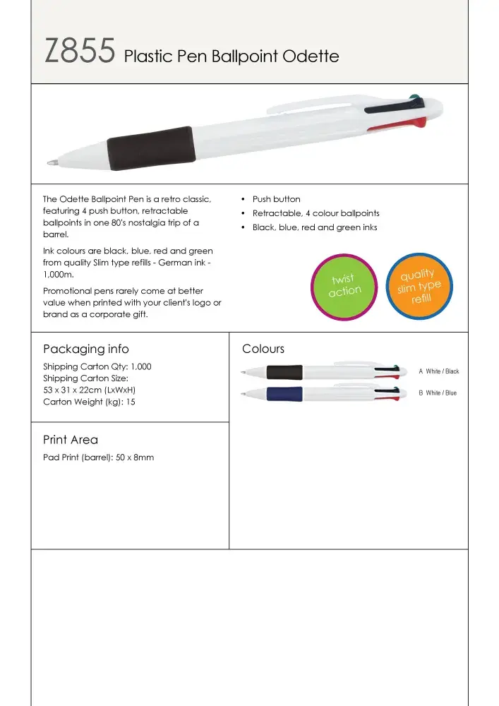 The Odette Ballpoint Pen is a retro classic, featuring 4 push button, retractable ballpoints in one 80's nostalgia trip of a barrel. Ink colours are black, blue, red and green from quality Slim type refills - German ink - 1,000m. Promotional pens rarely come at better value when printed with your client's logo or brand as a corporate gift.