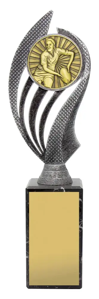Husky series of trophies on premium black marble allows for different award options for your activity. Appealing antique silver and gold combination over number of sizes.