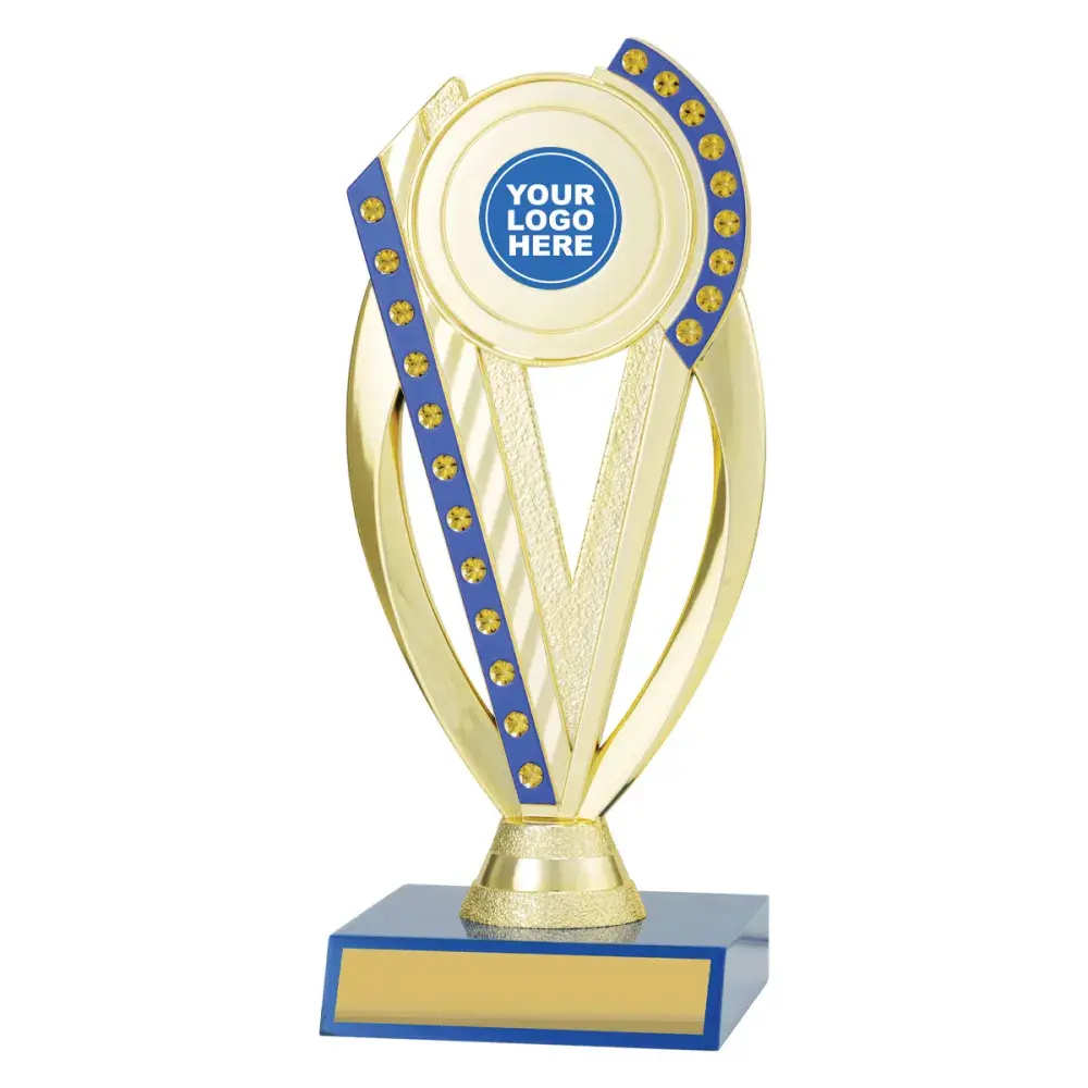 Series of blue column trophies that feature blue & gold trophy holder to showcase your custom logo or theme insert from the range available.