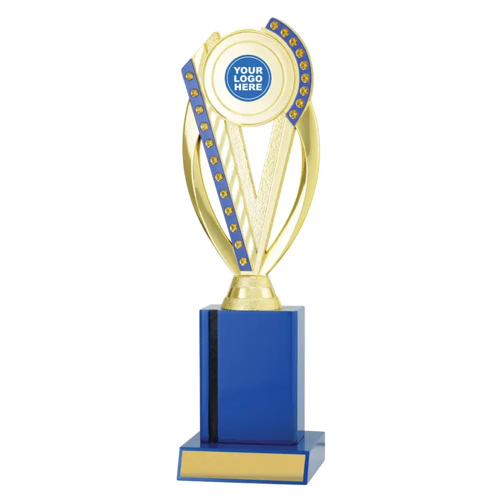 Series of blue column trophies that feature blue & gold trophy holder to showcase your custom logo or theme insert from the range available.