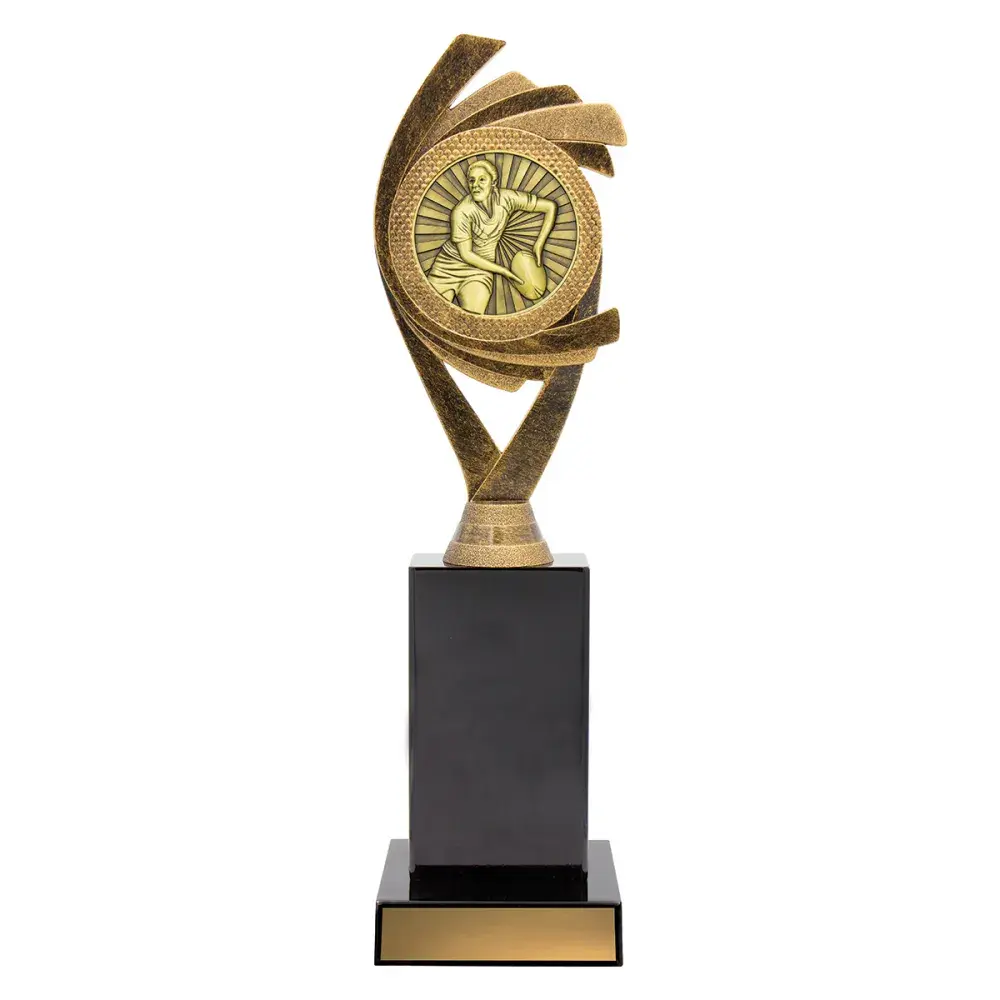 Dynamic design of holder trophies rendered in antique gold colours - male or female available.