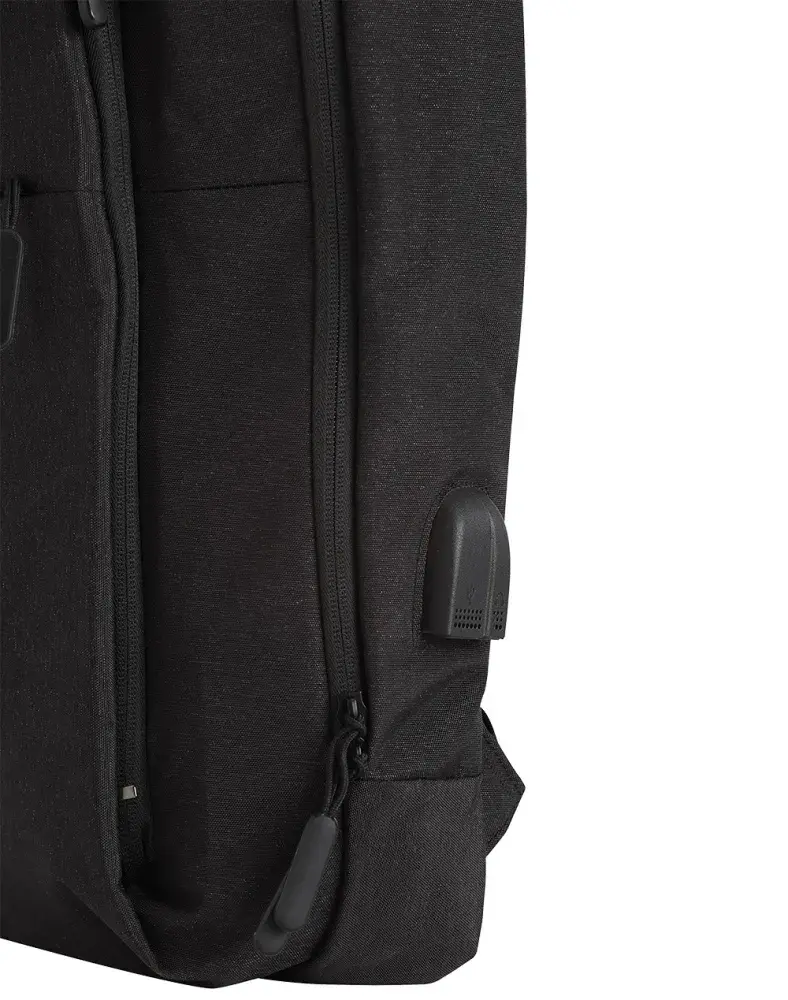 Back pack has strong hard padded carry handle. Suitable for decoration with badging, embroidery and heat transfer. Main compartment: secure padded laptop section – multi pocket section to accommodate mobile and hard copy docs. – Internal connecting computer charge cables to external bag charge connector. External face has three compartments with concealed zips. One luggage strap has internal zip pocket. Lower back zip compartment with smart