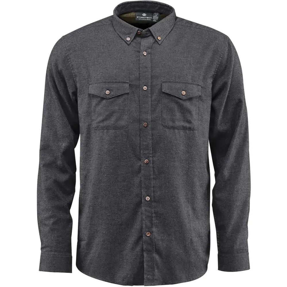 Premium easy care cotton-poly woven flannel long sleeve shirt features a tailored collar, contoured curve hem design, for casual wear settings and chest pockets for added functionality and style.
