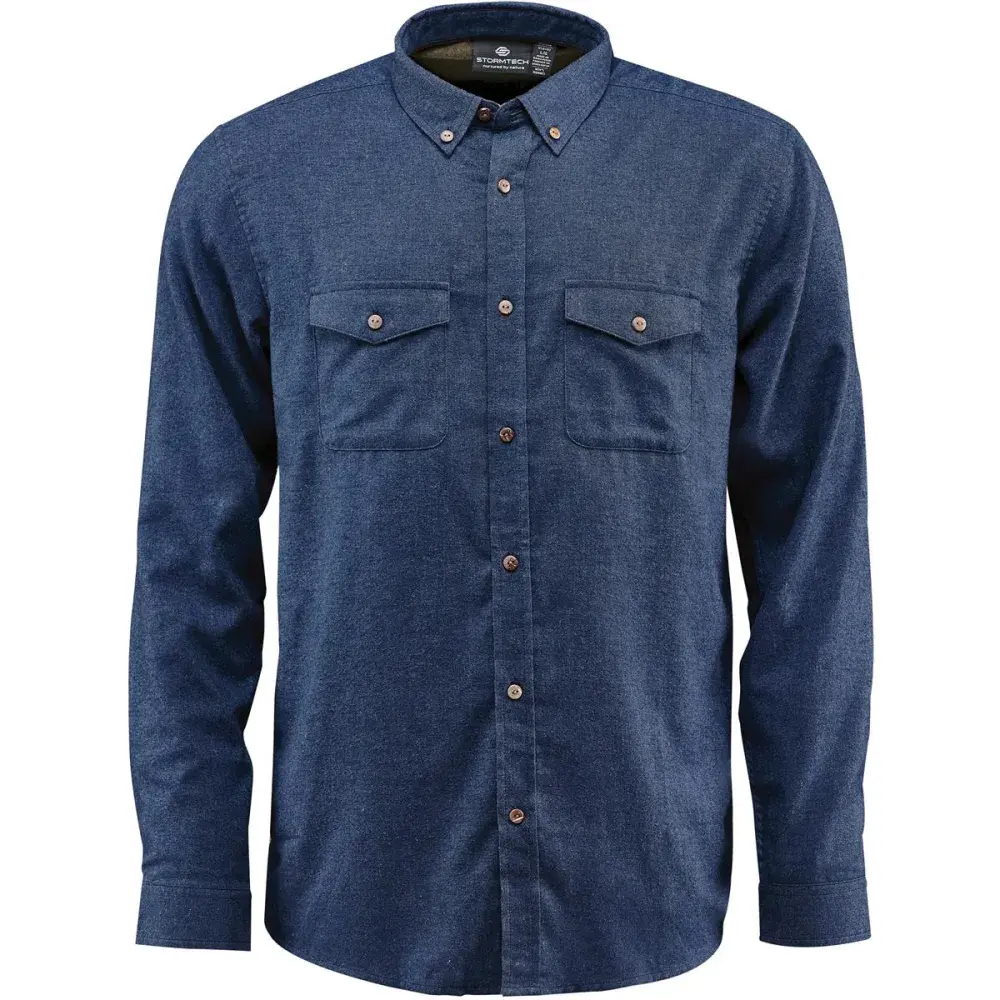 Premium easy care cotton-poly woven flannel long sleeve shirt features a tailored collar, contoured curve hem design, for casual wear settings and chest pockets for added functionality and style.