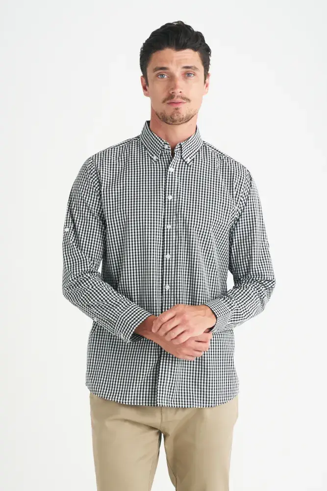 Button down collar, Roll up sleeve tab, Pearl buttons