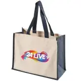 Made from 10oz cotton canvas jute trimming & sides, cotton webbing handles. Main compartment capacity is approximately 26 litres.