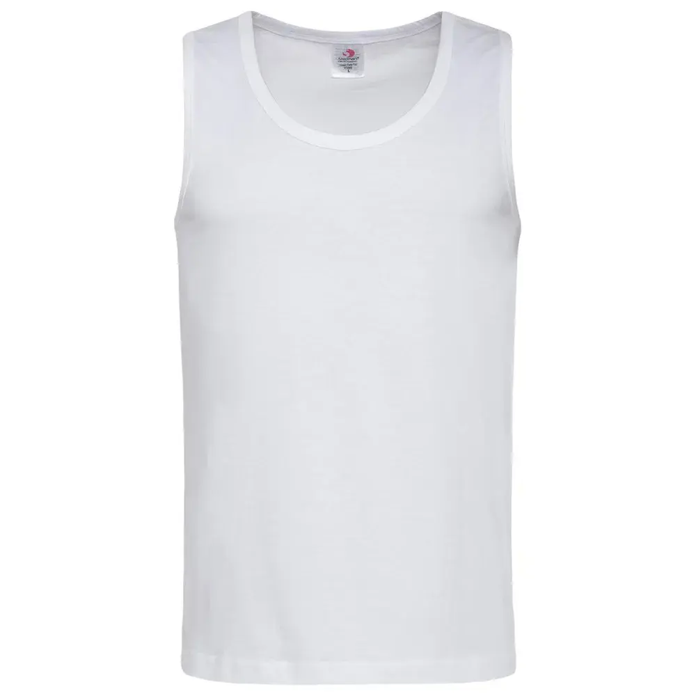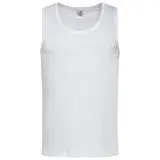 Soft tank top for men, without side seams, collar and arm holes with binding and made of durable single jersey cotton.