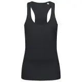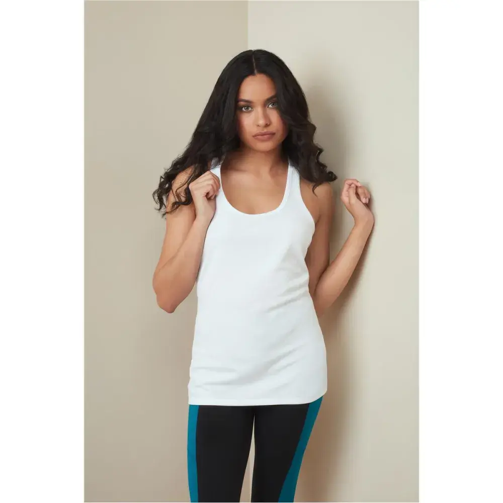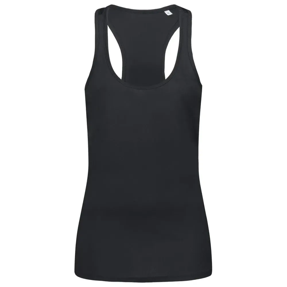 Modern and stretchy sports top with racerback for women made of quick-drying, breathable mesh-material with decorative flatlock seams and excellent freedom of movement.