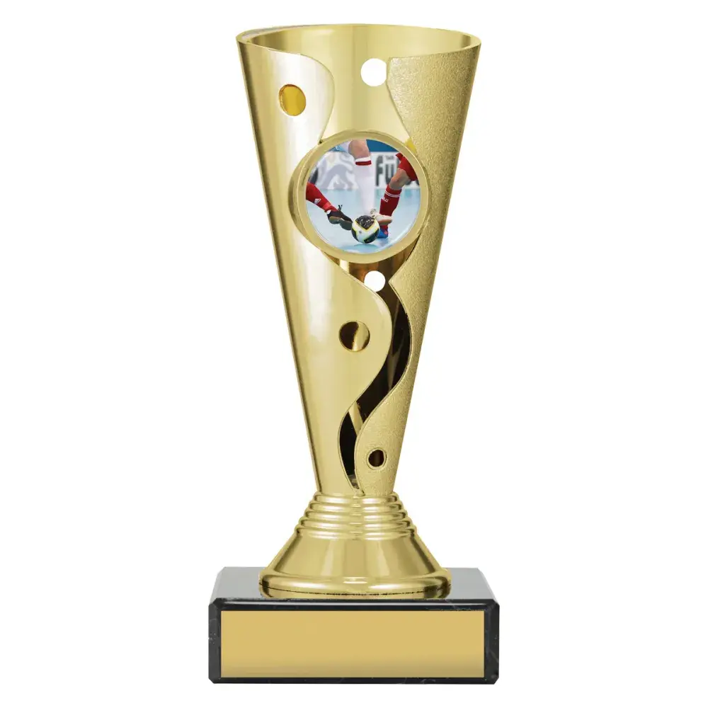 Carnival cups present a distinctive cup style trophy with attractive 3D design - on classic black marble base for your engraving - with brightly coloured insert for your sport. Trophies adaptable to your requirements.