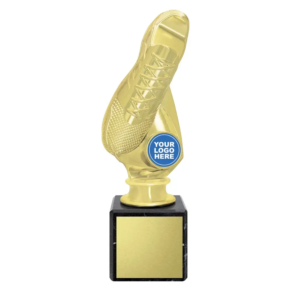 Glorious golden boot, the Domino series of trophies gives you the option to showcase your logo with a stylish top and premium black marble bases.
