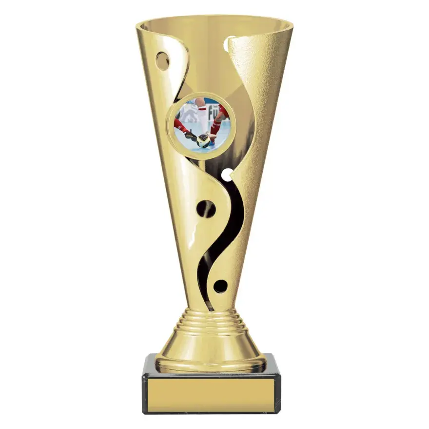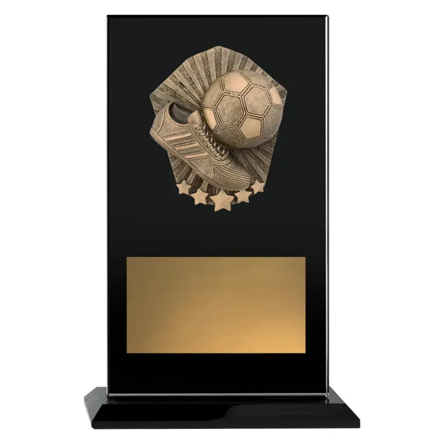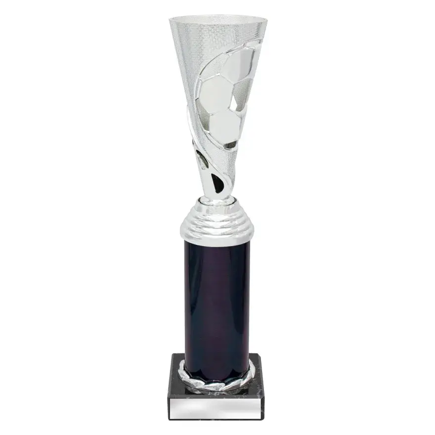 Football budget trophy series in antique silver and gold, a popular choice for football clubs and teams. An effective design with prominent soccer elements. Generic theme award with the option for customisation.