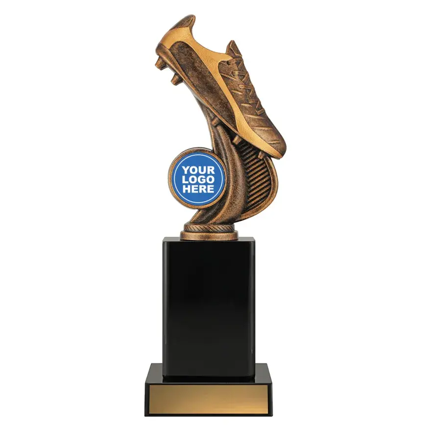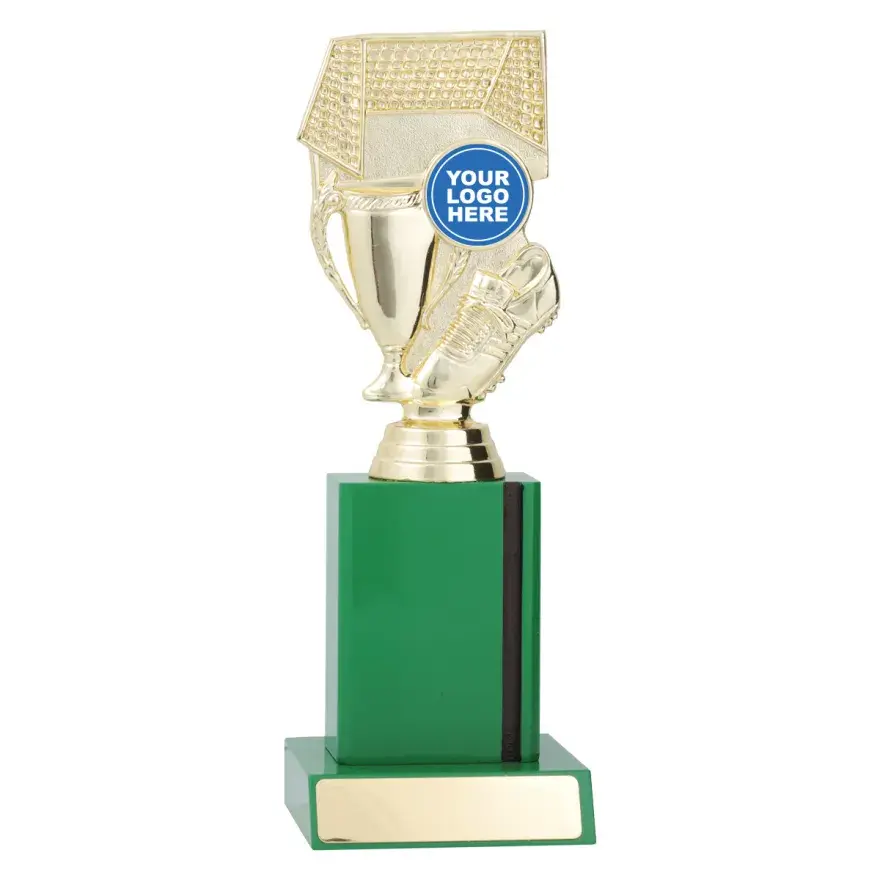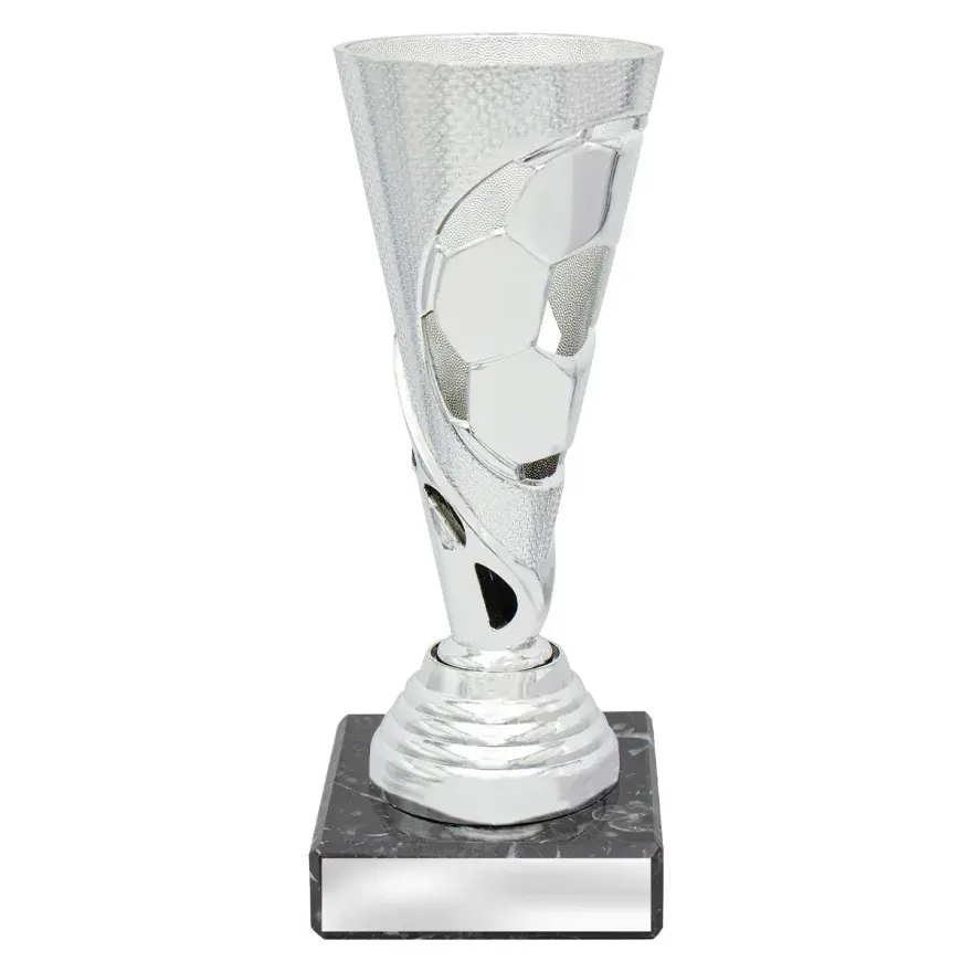 Football budget trophy series in antique silver and gold, a popular choice for football clubs and teams. An effective design with prominent soccer elements. Generic theme award with the option for customisation.
