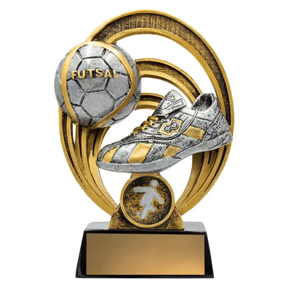 Innovative design in 3 convenient sizes, the gold and silver Halo Trophy Series is perfect for players of all ages. The Futsal design features the classic boot and ball combination. Includes the space if required for your team logo.
