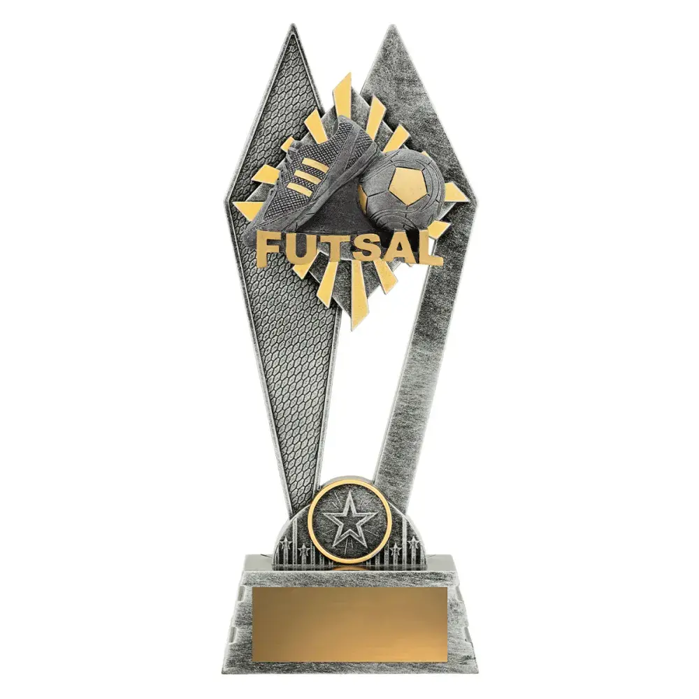 The Peak Series - for Futsal - is an innovative trophy series offering super value for such an impressive size range. An elevated design that showcases the futsal shoe & ball elements against a vibrant sunray style background.