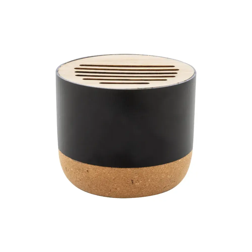 Made with recycled aluminium housing for eco-conscious durability. | Natural bamboo mesh and cork base for a sustainable finish. | 400 mAh rechargeable battery for long-lasting playback. | Includes USB charging cable for convenient recharging. | Compact, stylish, and portable design for everyday use.