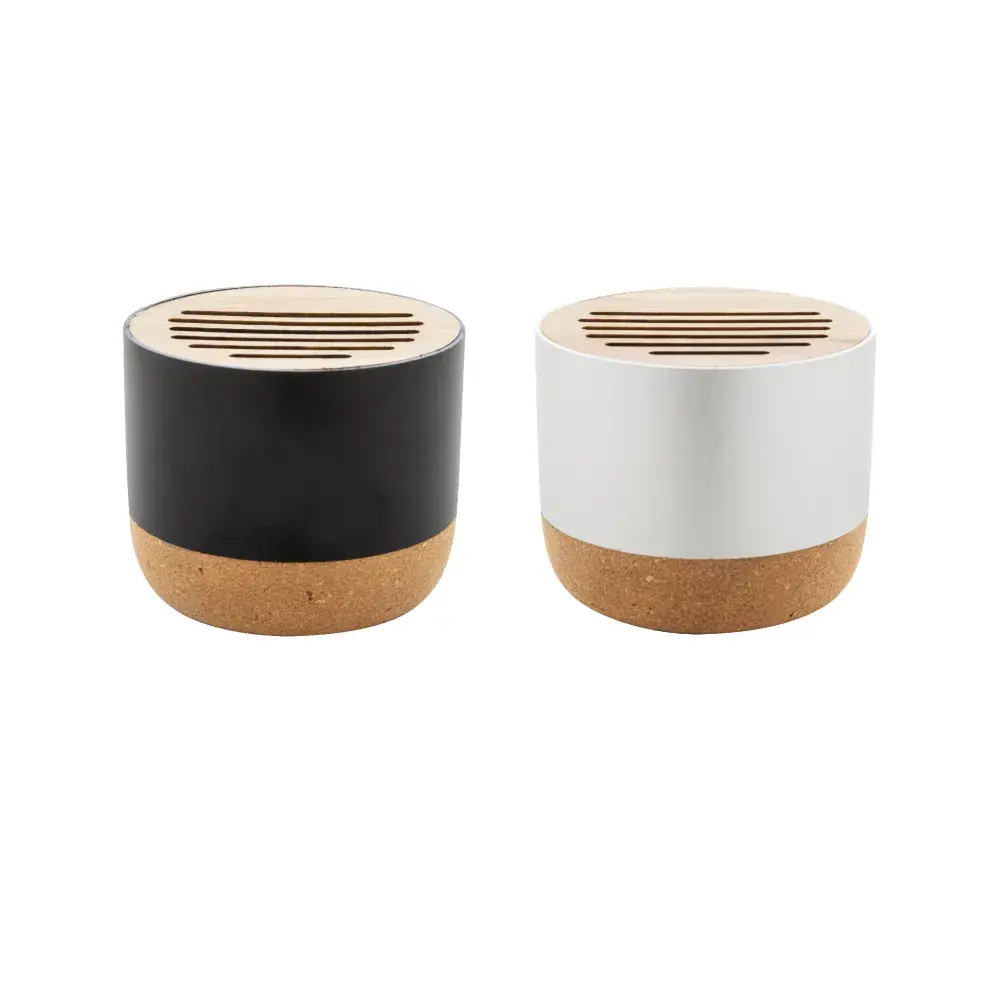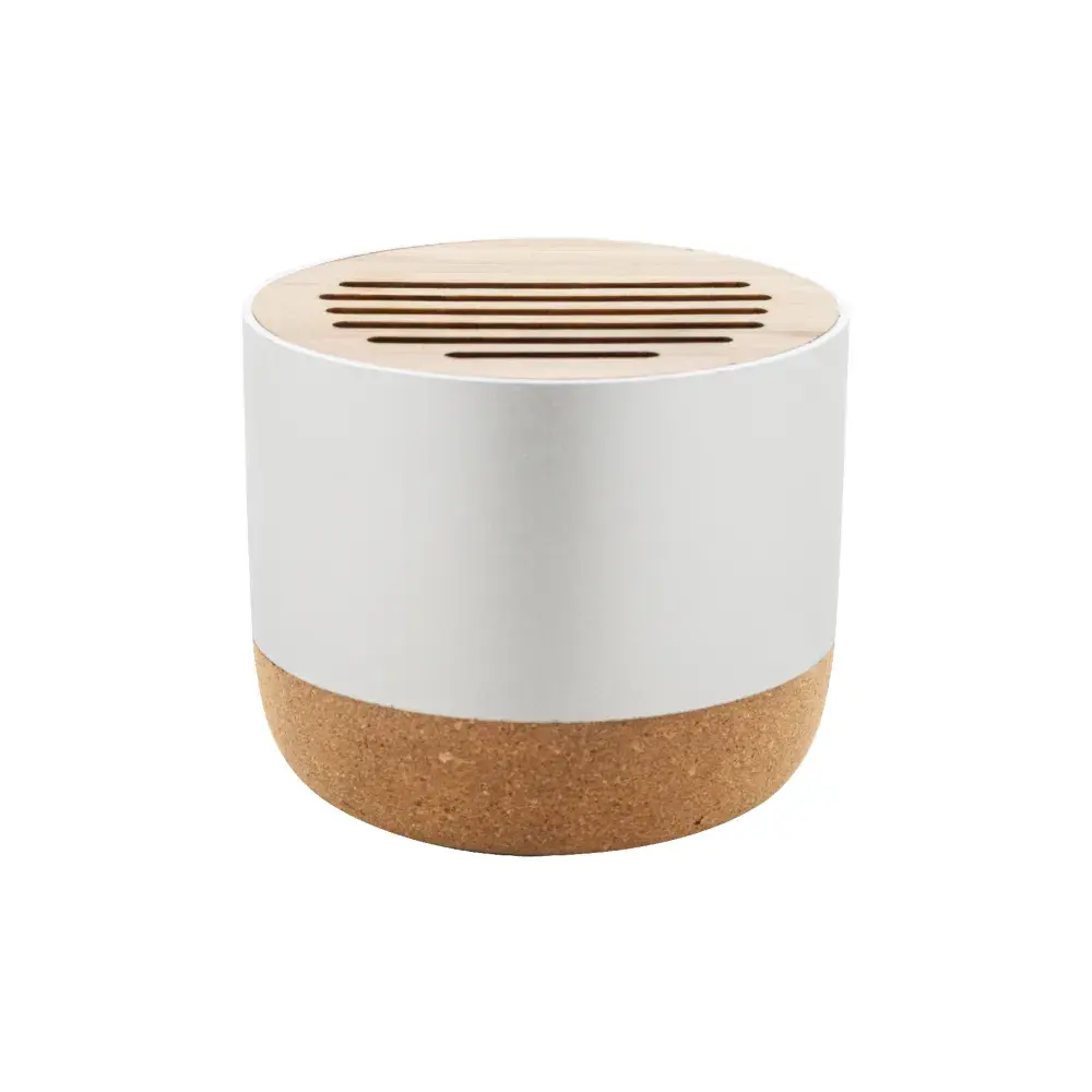 Made with recycled aluminium housing for eco-conscious durability. | Natural bamboo mesh and cork base for a sustainable finish. | 400 mAh rechargeable battery for long-lasting playback. | Includes USB charging cable for convenient recharging. | Compact, stylish, and portable design for everyday use.