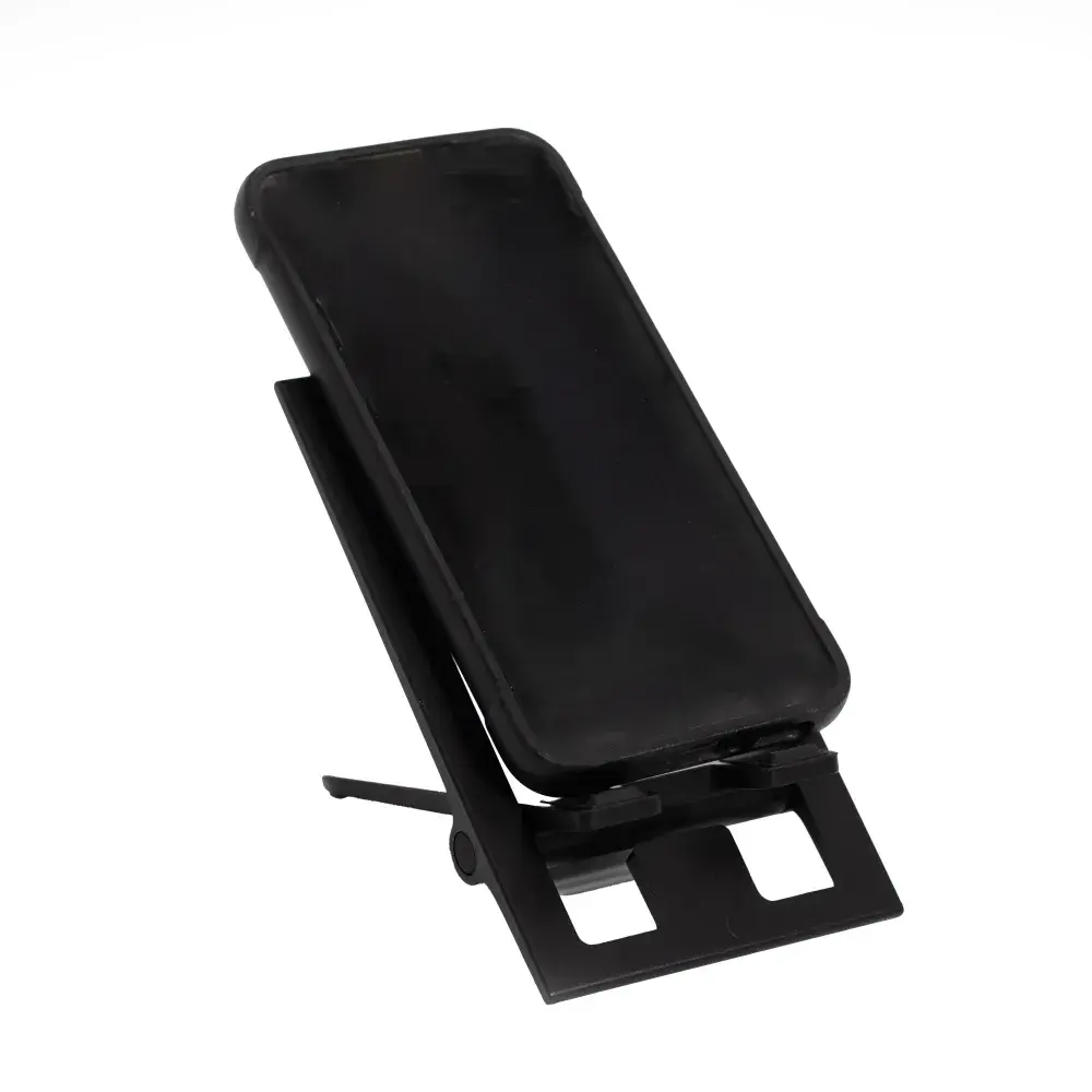 This slim phone stand keeps screens steady and hands free without hogging desk space. Made from ABS with silicone grips for a secure hold, it folds down flat and pops up fast, making it easy to stash in a bag or drawer. Lightweight, clean, clever and ready to show off your logo. It's a tidy little crowd-pleaser for promos, events and everyday workdays.