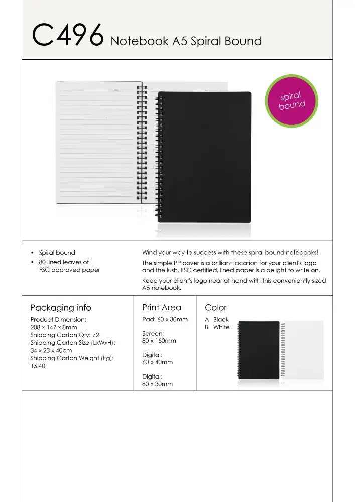 Wind your way to success with these spiral bound notebooks! The simple PP cover is a brilliant location for your client's logo and the lush, FSC certified, lined paper is a delight to write on. Keep your client's logo near at hand with this conveniently sized A5 notebook.