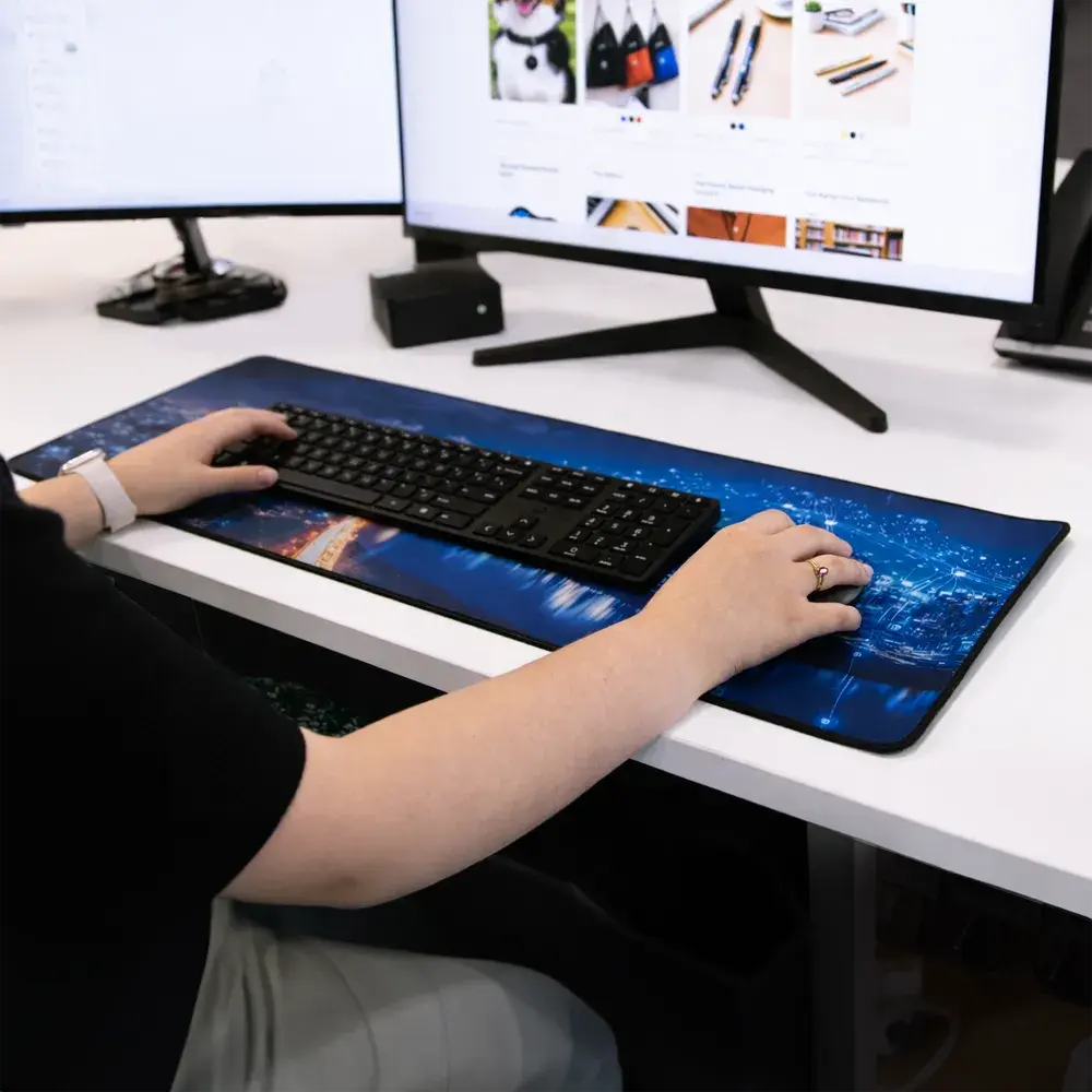 Big enough to frame a full workstation yet tidy on the desk, it’s built for long hours, quick clean-ups and brand visibility that sits front and centre every working day.