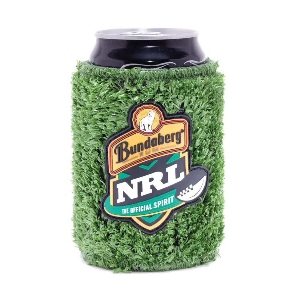 Realistic fake grass exterior for novelty appeal. | Insulated neoprene lining for maximum chill retention. | Fits standard cans and bottles. | Durable and flexible construction. | Great for parties, events, and promotional giveaways.