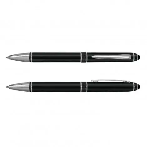 Twist-action plastic ball pen with black trim which has a stylus for use with touch screens and a black refill with 600 metres of German manufactured Dokumental ink and can be presented in an optional pen sleeve.