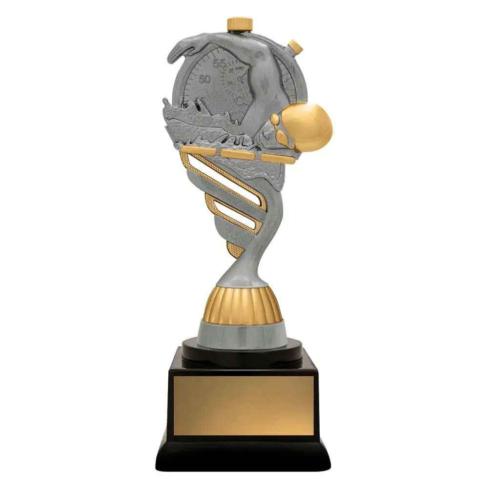 Swim trophies in 3 sizes, a reliable option to award participants in swimming events and with a design finished in antique silver & gold.