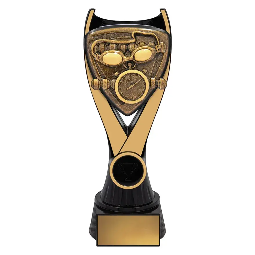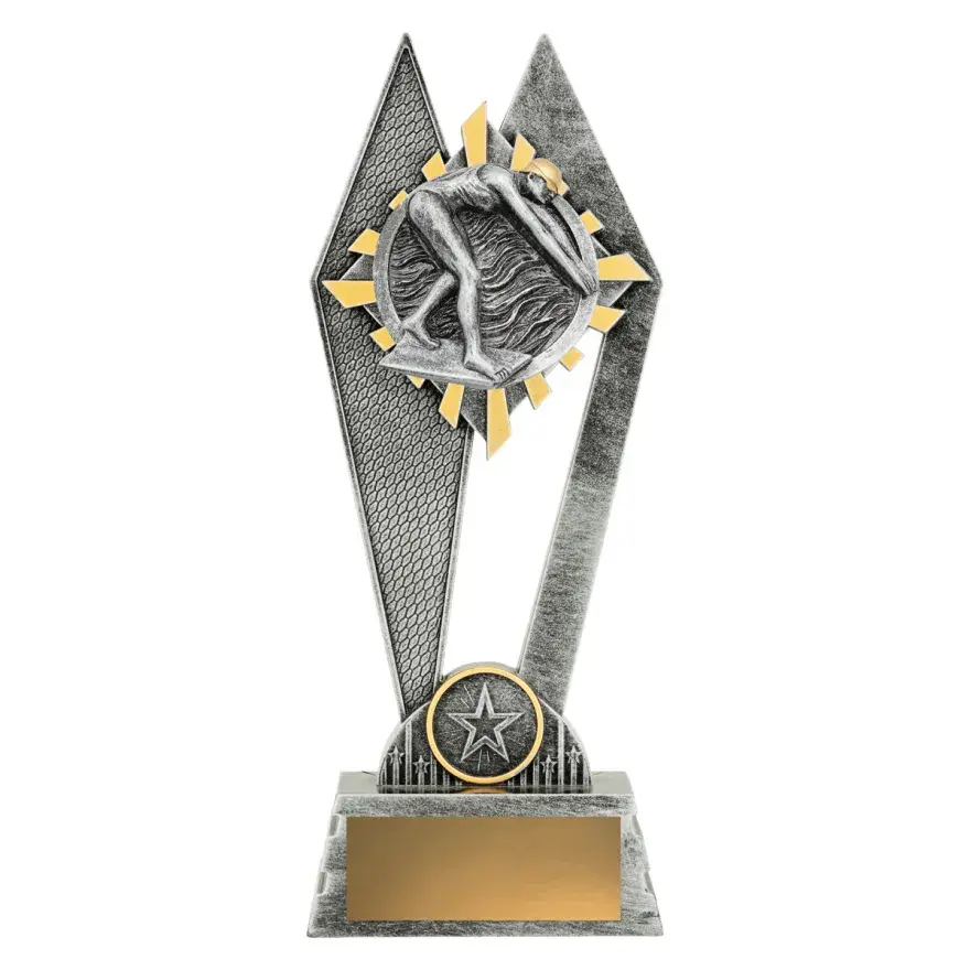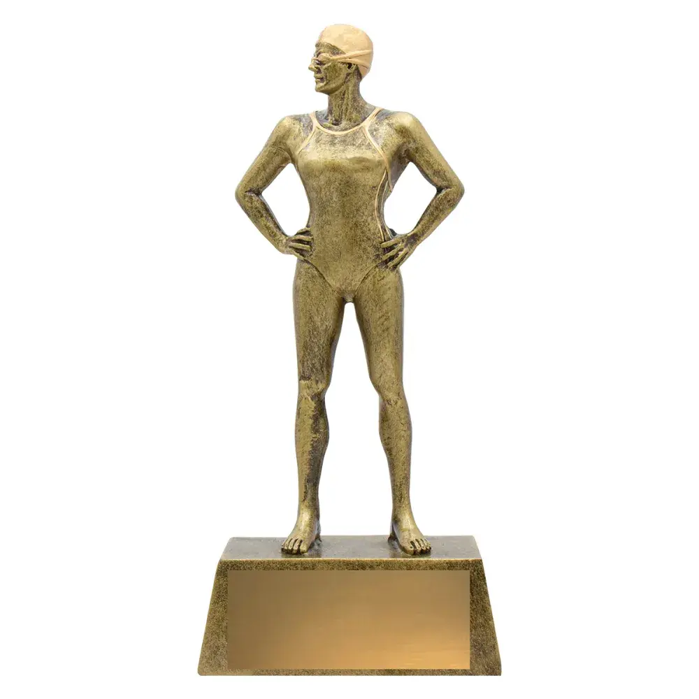 The Hero Trophy series features an iconic champion pose to represent the pinnacle in achievement for swimming. The classic gold trophy series in 3 sizes with significant room for engraving on a substantial base.