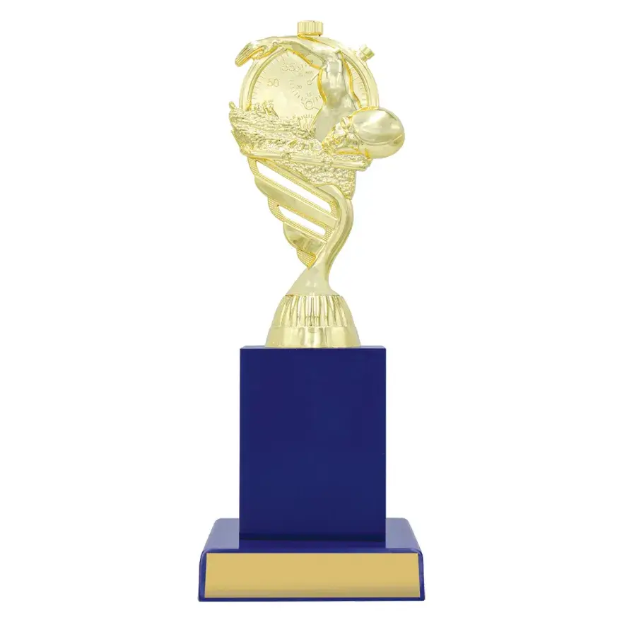 Brilliant Swim trophy features googles, stop-watch and diving block. Gambit offers a dynamic theme in antique silver & gold - space for your custom logo.
