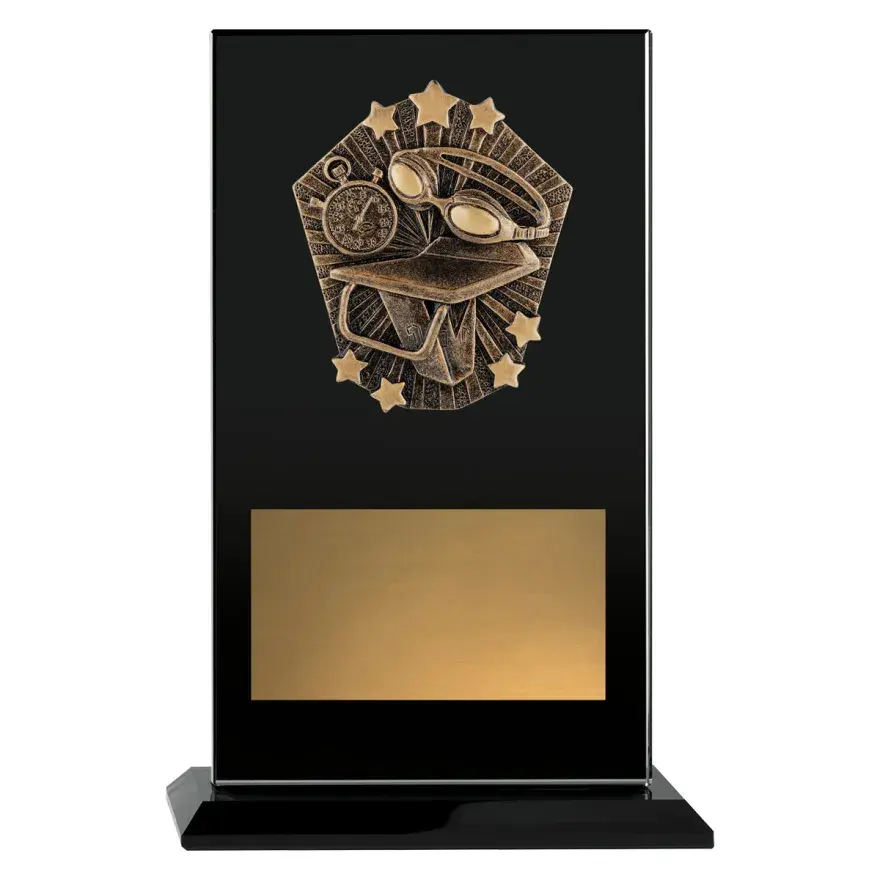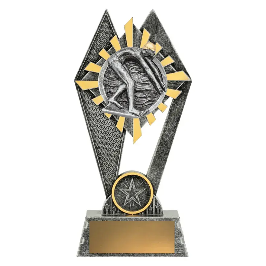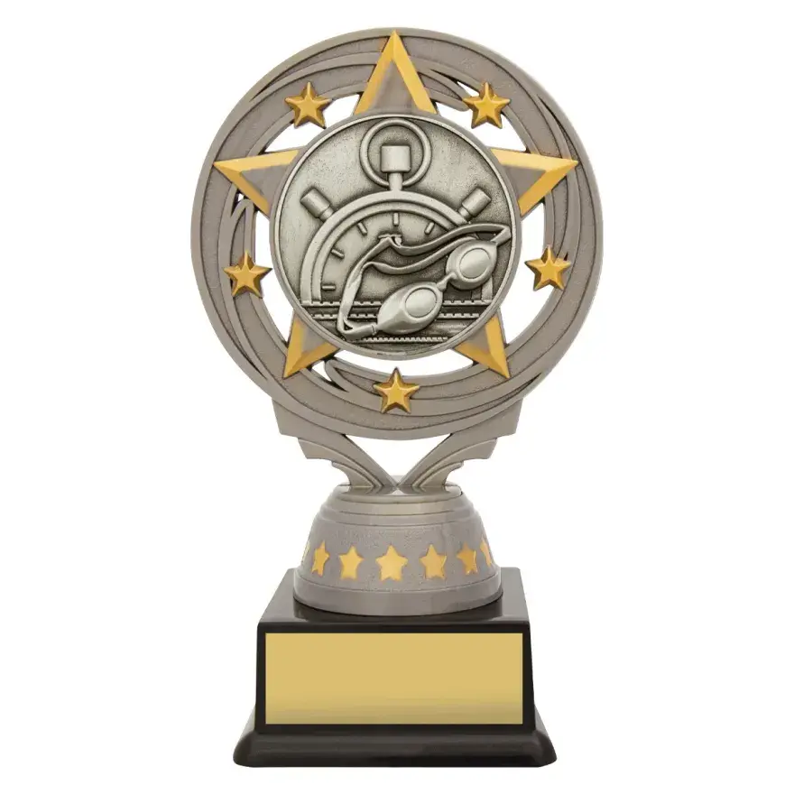 Classic wreath and shield inspired design, the Swim Trophy Gold Shield is an affordable and popular award choice. The trophy series features male & female swimmers for a generic award that is available in 3 convenient sizes.