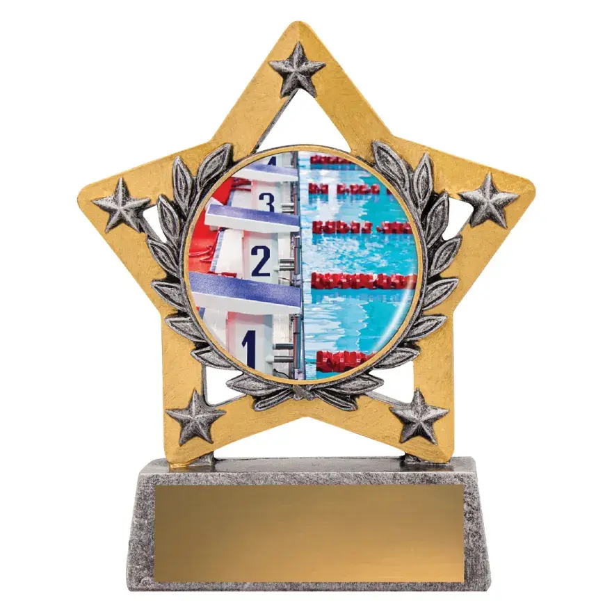 Classic wreath and shield inspired design, the Swim Trophy Gold Shield is an affordable and popular award choice. The trophy series features male & female swimmers for a generic award that is available in 3 convenient sizes.