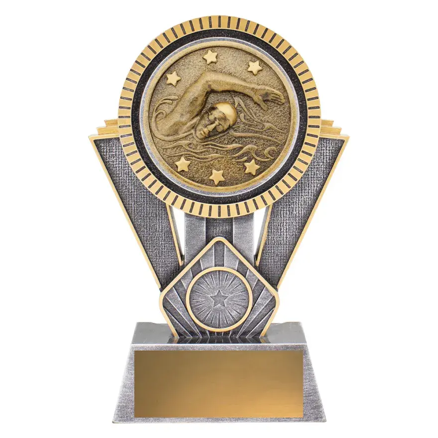 The Hero Trophy series features an iconic champion pose to represent the pinnacle in achievement for swimming. The classic gold trophy series in 3 sizes with significant room for engraving on a substantial base.