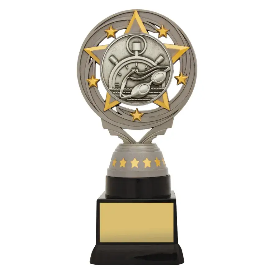 An exciting flash inspired design, the Shazam Series in a vibrant silver & gold combination, is perfect for various awards at your event. Swimming trophies feature the space for your logo if required.