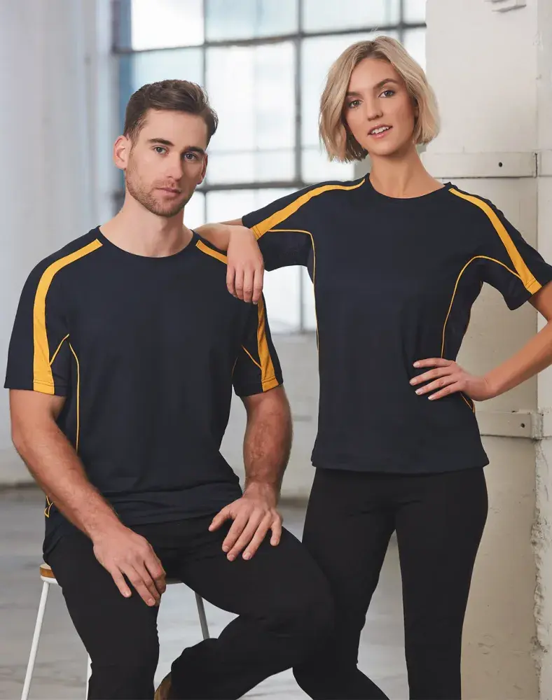 Description: Breathable mesh panels under arms & on sides. Short sleeves. Contrast panels and piping on shoulders and sleeves - front and back.
