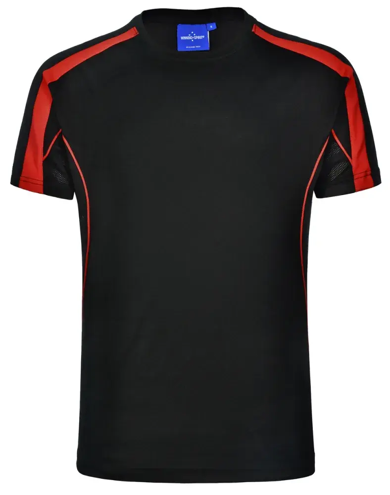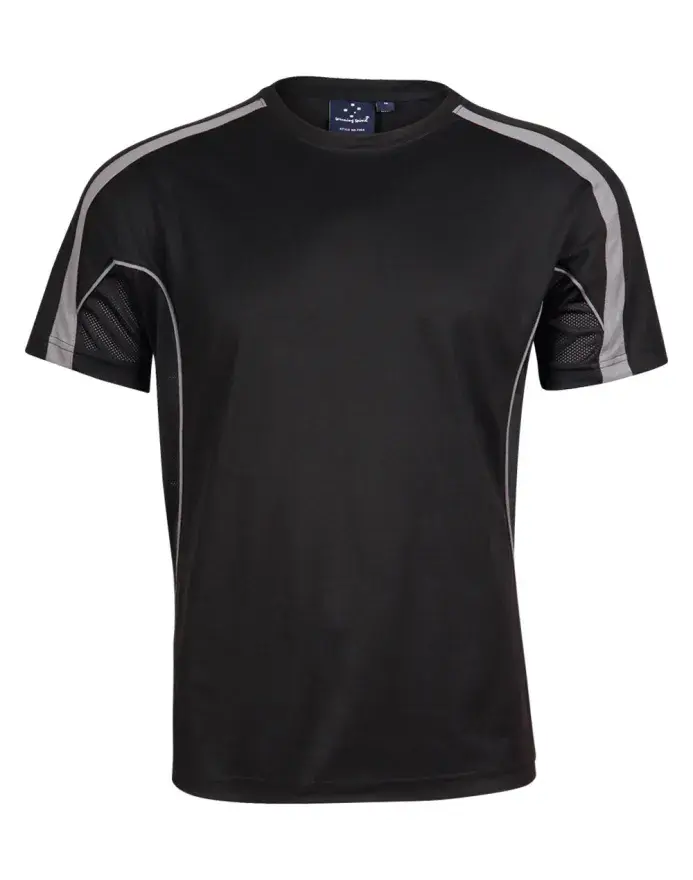 Description: Breathable mesh panels under arms & on sides. Short sleeves. Contrast panels and piping on shoulders and sleeves -- front and back.