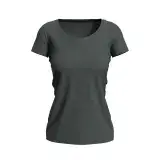 Single jersey "full feeder", reinforced shoulder seams, fashionable wide neck drop, slim rib collar, small sleeve hems, contrast neck tape, side seams, small size label in the collar, care label in the side seam.