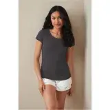 Fitted T-shirt for women, with fashionable length made of soft and sleek cotton-elastane-blend with contrast neck tape.