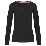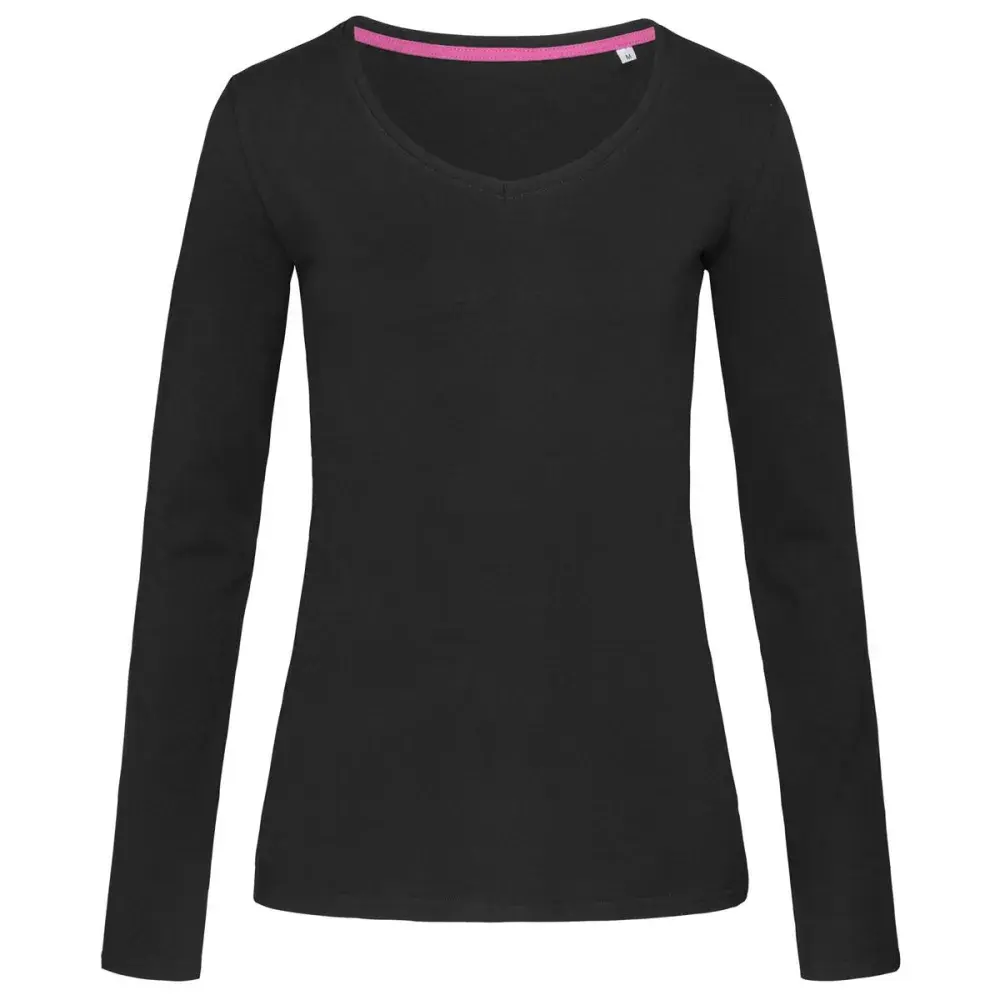Fitted long sleeve T-shirt for women, with fashionable length made of a soft and sleek cotton-elastane-blend with wide V-neck drop and contrast neck tape.