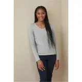 Fitted long sleeve T-shirt for women, with fashionable length made of a soft and sleek cotton-elastane-blend with wide V-neck drop and contrast neck tape.